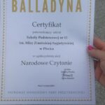 W sobotnie popołudnie 5 września 2020 roku w ogrodzie Książnicy Płockiej miało miejsce niecodzienne wydarzenie. W ramach ogólnopolskiej akcji odbyło się Narodowe Czytanie „Balladyny” Juliusza Słowackiego. Patronat honorowy nad akcją objęła Para Prezydencka. Fragmenty książki pięknie czytała reprezentacja naszej szkoły – Helena Kaczmarczyk (Balladyna), Kacper Kosowski (Kirkor), Bartosz Ciechomski (Kostryn). Uczniowie z klasy 8a odebrali z rąk Pani Dyrektor Joanny Banasiak Certyfikat potwierdzający udział w tym niezwykle ważnym wydarzeniu kulturalnym. Uczniom towarzyszyła p. Magdalena Drabik.