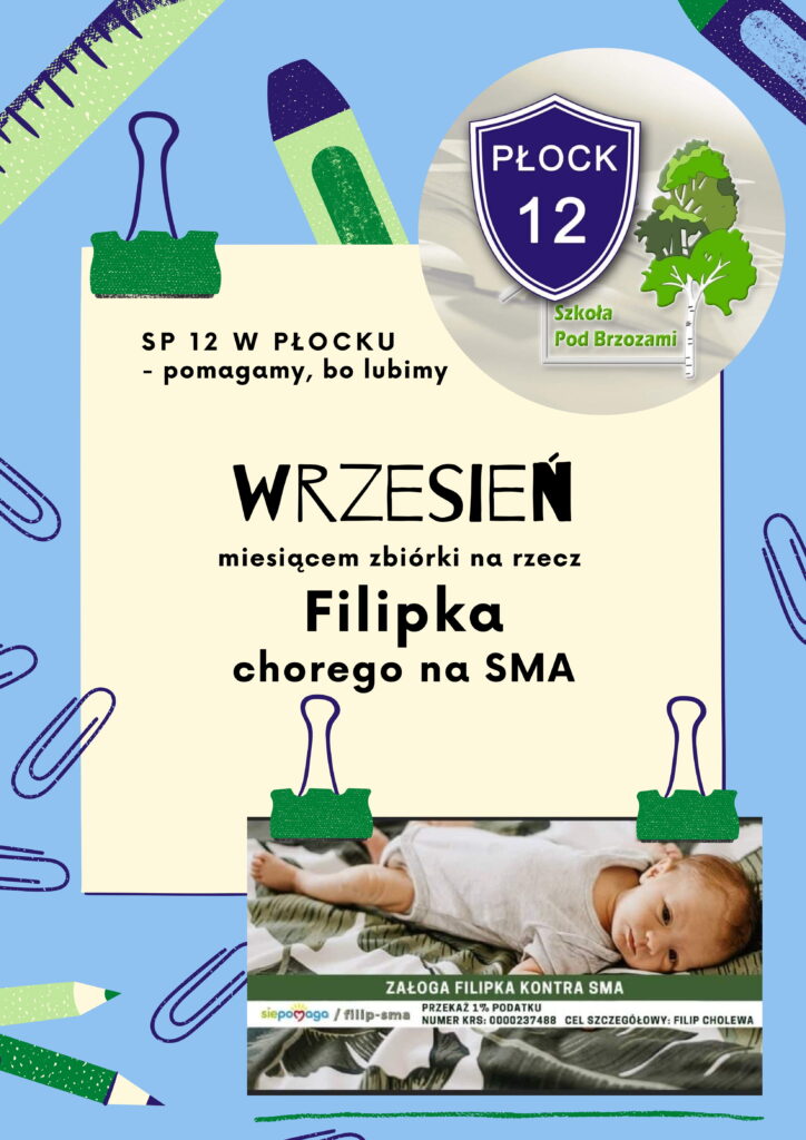 Nowy Rok Szkolny to nowe wyzwania. Naszą działalność charytatywną chcemy rozpocząć od akcji „WRZESIEŃ MIESIĄCEM ZBIÓRKI DLA FILIPKA CHOREGO NA SMA”. Z pewnością pamiętacie, jak ponad rok temu mieszkańcy Płocka i okolic ramię w ramię zbierali środki dla chorej Zosi. Dziś Zosia jest już po terapii genowej i ma się świetnie. Jej Armia, czyli także MY, chce pomagać dalej, bo uzbieranie kwoty ponad dziewięciu milionów złotych to ogromne wyzwanie.
