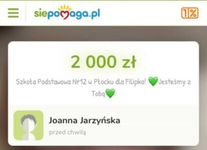 Hallo! Hallo! Tu WOLONTARIAT! Miesiąc wrzesień upłynął nam pod hasłem zbiórki pieniędzy do puszek dla Filipka chorego na SMA. W szkole zostało przeprowadzonych pięć zbiórek, którym przewodniczyły nasze pracowite wolontariuszki i dzielni wolontariusze. Z Waszym udziałem i ogromną pomocą udało się zebrać 2000 złotych, w tym 2 Euro i 10 centów. Składamy ogromne podziękowania za [….] Czytaj więcej…