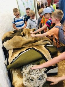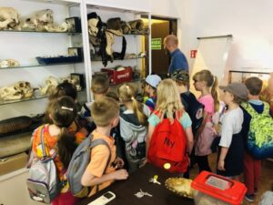 W sali dydaktycznej mieliśmy okazję dotknąć skórę dzikiego zwierza, kawałek zęba słonia, czaszkę małpy, wylinkę czy szkielet.