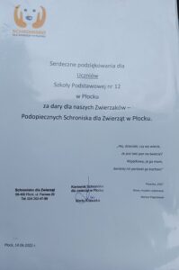W czerwcu uczennice klasy 6B Hanna Zmysłowska i Barbara Warda zorganizowały w szkole zbiórkę na rzecz Schroniska dla zwierząt w Płocku.