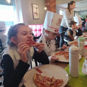 W środę 1 lutego uczniowie klasy II b uczestniczyli w warsztatach kulinarnych ,,Mały Kucharz” w pizzerii. Poznali historię pizzy. Następnie każdy mógł własnoręcznie ją wykonać. Po wypieczeniu była degustacja. Pizza była pyszna. Na koniec dzieci wzięły udział w quizie podsumowującym zajęcia. Było rewelacyjnie!