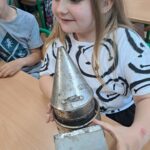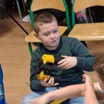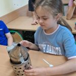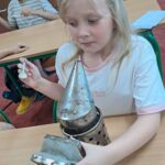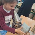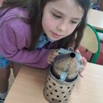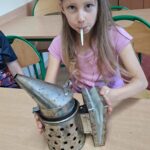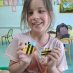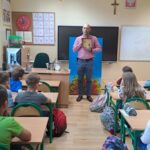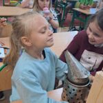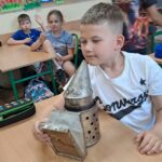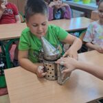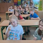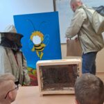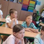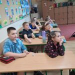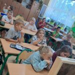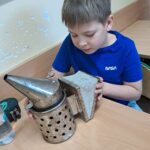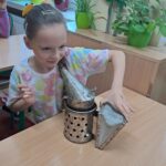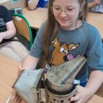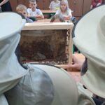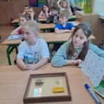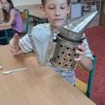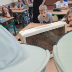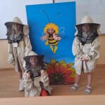 Drugie zajęcia, w maju 2024 roku, poświęcone były pszczołom miodnym i ich niezastąpionej roli w przyrodzie. Pan Radomir Lewandowski pokazał dzieciom świat tych owadów widziany okiem pszczelarza. Każdy uczestnik spotkania, w czasie zajęć, stał się pszczelarzem i ubrany w strój pszczelarski mógł korzystać ze specjalistycznego sprzętu oraz obserwować życie pszczół w ulu. To właśnie pszczoły, dostarczone na zajęcia w specjalnym szklanym ulu, wywołały największe poruszenie. Żeby wrażenia z poznawania świata tych fascynujących owadów były pełne, każdy chętny mógł spróbować najważniejszego z pszczelich produktów – miodu. Dzieci poznały również język jakim porozumiewają się te fascynujące owady, a jest nim …taniec. To za pomocą tańca pszczoły opowiadają sobie o miejscach, w których kwitną kwiaty. Wszyscy uczestnicy zajęć mogli wspólnie zatańczyć „ósemkowy” taniec pszczół. Uczniowie dowiedzieli się również o roli pszczół w przyrodzie i rolnictwie. To dzięki zapylaniu kwiatów przez pszczoły mamy owoce i warzywa, a produkty pszczele (miód, wosk, pyłek i mleczko pszczele) są ważnym składnikiem wielu lekarstw i kosmetyków. Te zajęcia były pierwszymi z zaplanowanych we współpracy z Ogrodem Zoologicznym i wszystko wskazuje na to, że nasi uczniowie będą mieli jeszcze wiele okazji na poznawanie fascynującego świata przyrody.